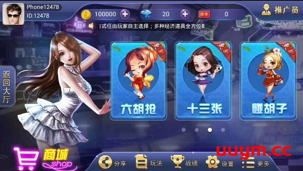金币场: 斗地主 跑胡子 九莲宝灯 宝石风暴 金蝉捕鱼 红中麻将 六胡抢 十三张 碰胡子 跑得快 血战麻将