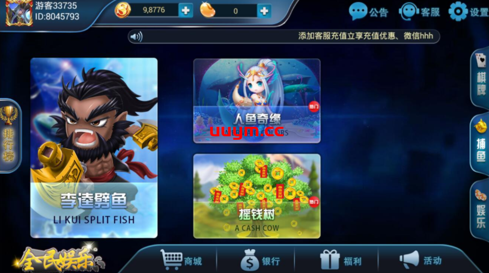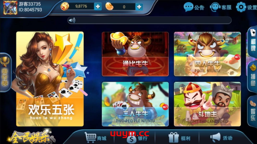 已有游戏玩法:欢乐五张:通比牛牛,二人牛牛,四人牛牛,斗地主,扎金花,李逵劈鱼,人鱼奇缘,摇钱树水浒传,飞禽走兽,连环夺宝,三九连线,百人牛牛,百人s宝,豪车俱乐部,欢乐三十秒