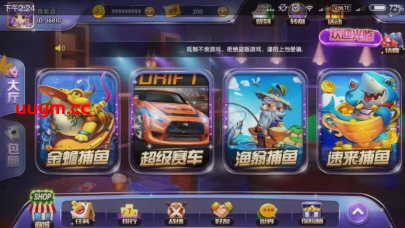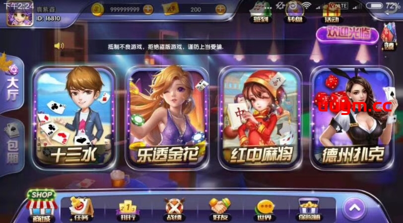 已有游戏玩法:水浒传 摇钱树 速来捕鱼 龙马奔腾 超级赛车 大白鲨 欢乐牛牛 血战麻将 乐透金花 四人牛牛 ATT翻牌机 天天牛牛 百家乐 欢乐斗地主