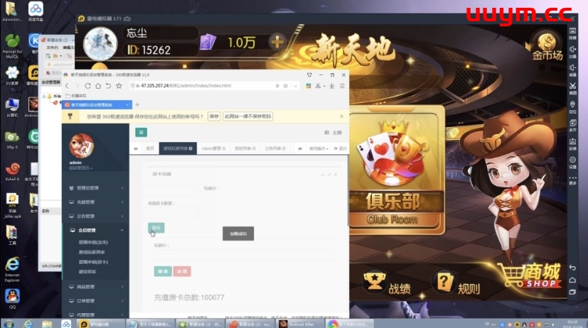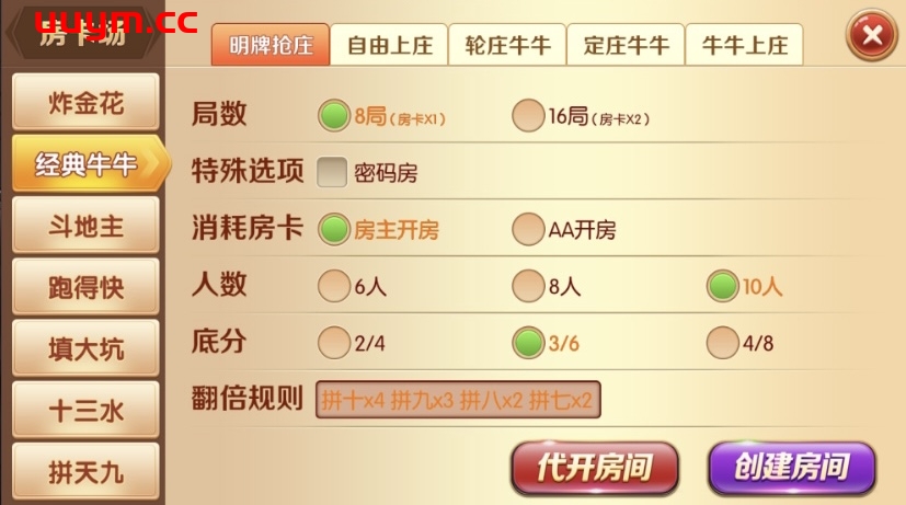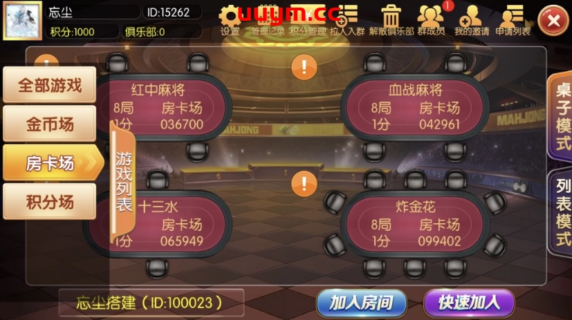 游戏模式:房卡加金币双模式,带俱乐部功能,后台可控制,包含APP双端。