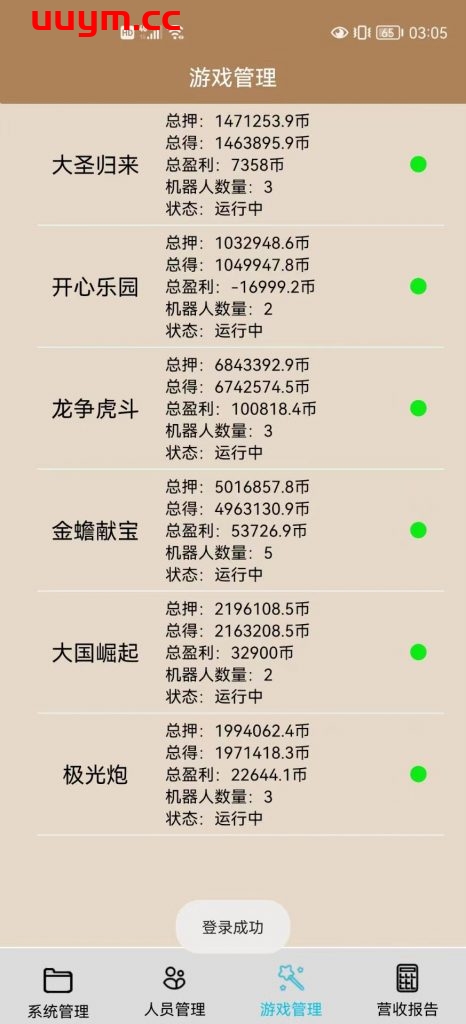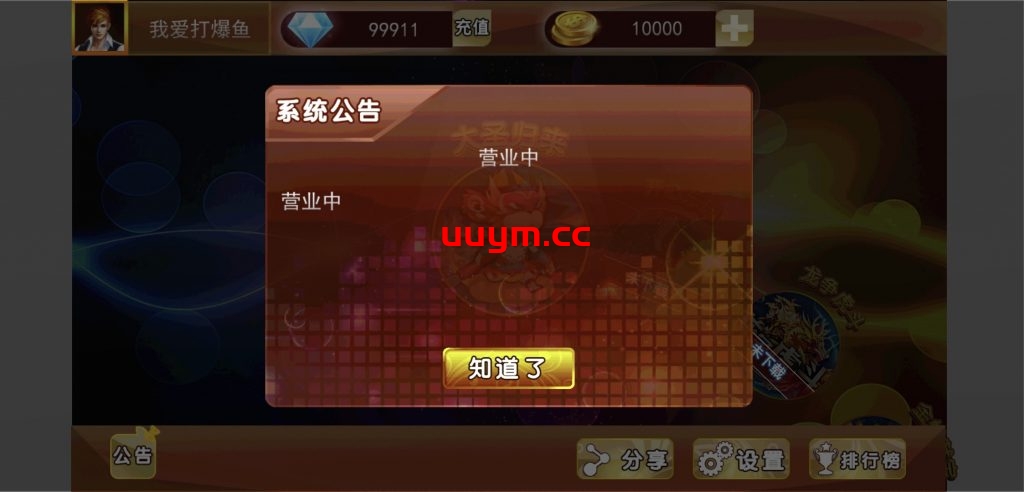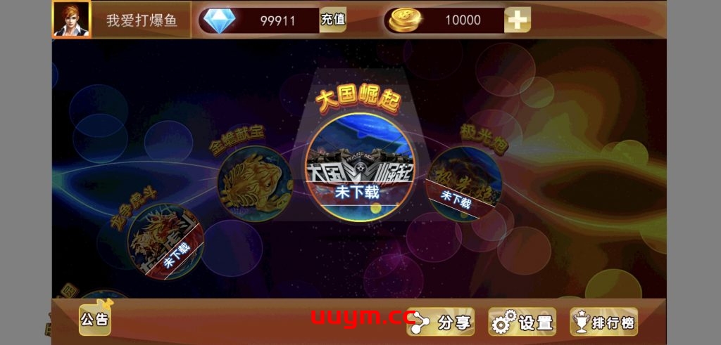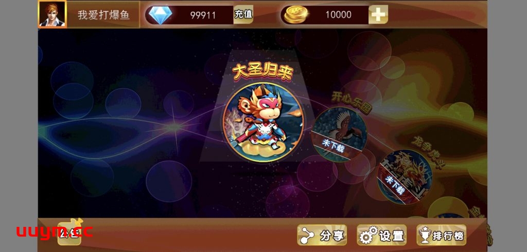6个子游戏:大圣归来 开心乐园 龙争虎斗 金蟾献宝 大国崛起 极光炮